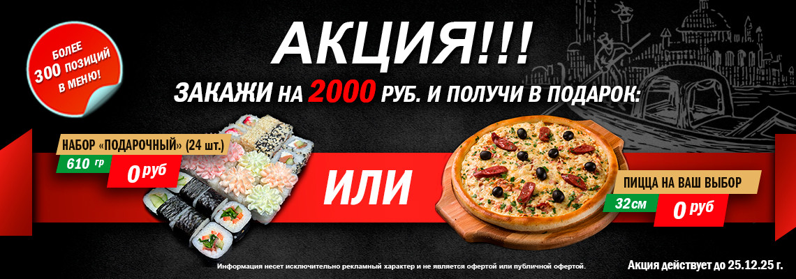 Служба доставки «Венеция» рада предложить вам аппетитную пиццу. У нас вы всегда можете купить суши и роллы. Нами осуществляется доставка пиццы и суши в любую точку города. Если вы находитесь на окраине населённого пункта, мы также к вашим услугам. Принимаем заказы до позднего вечера.
