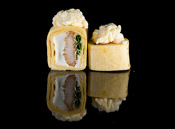Сырная лепешка с жареным куринным филе, мягким сыром, зеленым лучком и сыром гауда.