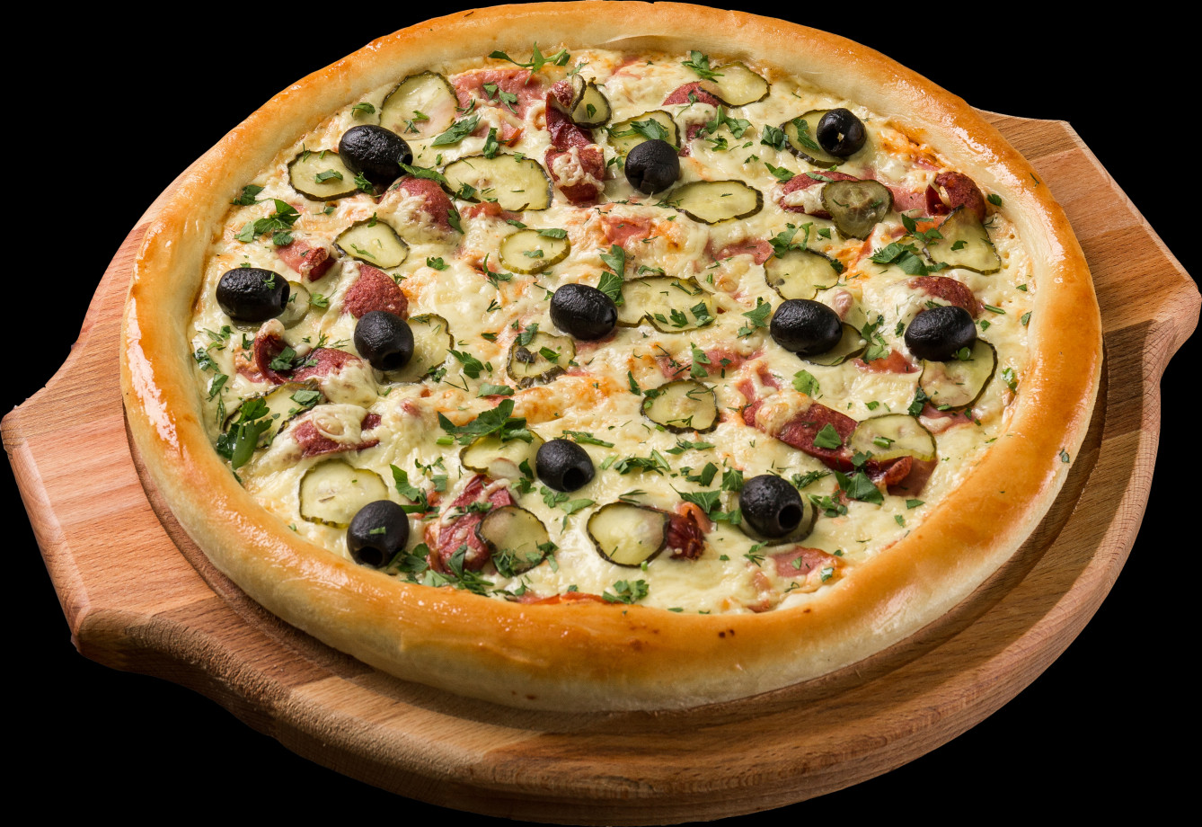 Фирменный соус, ветчина, колбаски охотничьи, маринованные огурцы, сыр гауда, оливки, зелень.