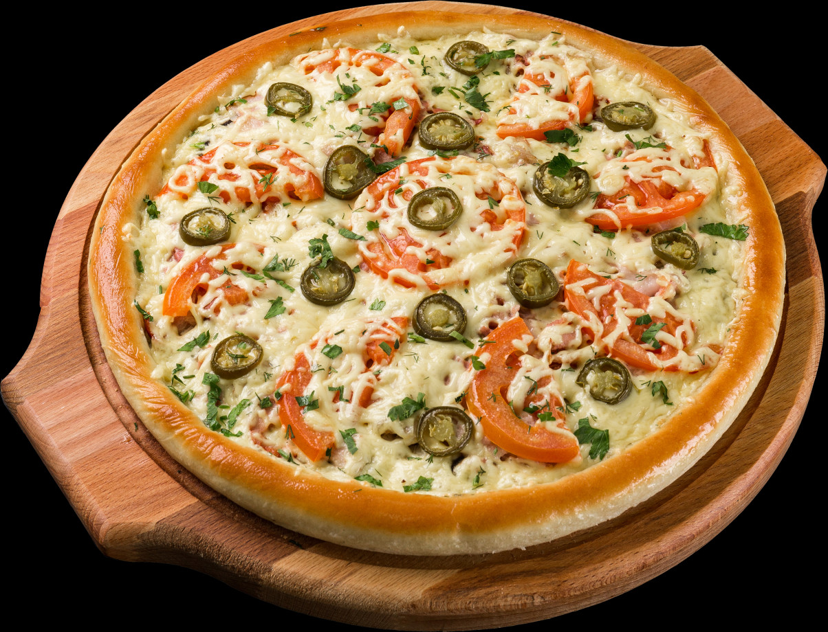 Чесночный соус, буженина, бекон, шампиньоны, помидоры, сыр гауда, перец халапеньо, зелень.