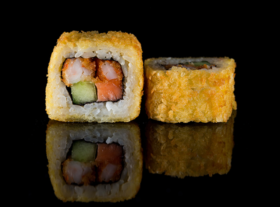 Горячий ролл с лососем, креветкой и огурцом.