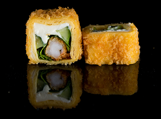 Горячий ролл с креветкой, огурцом, листом салата и сливочным сыром.