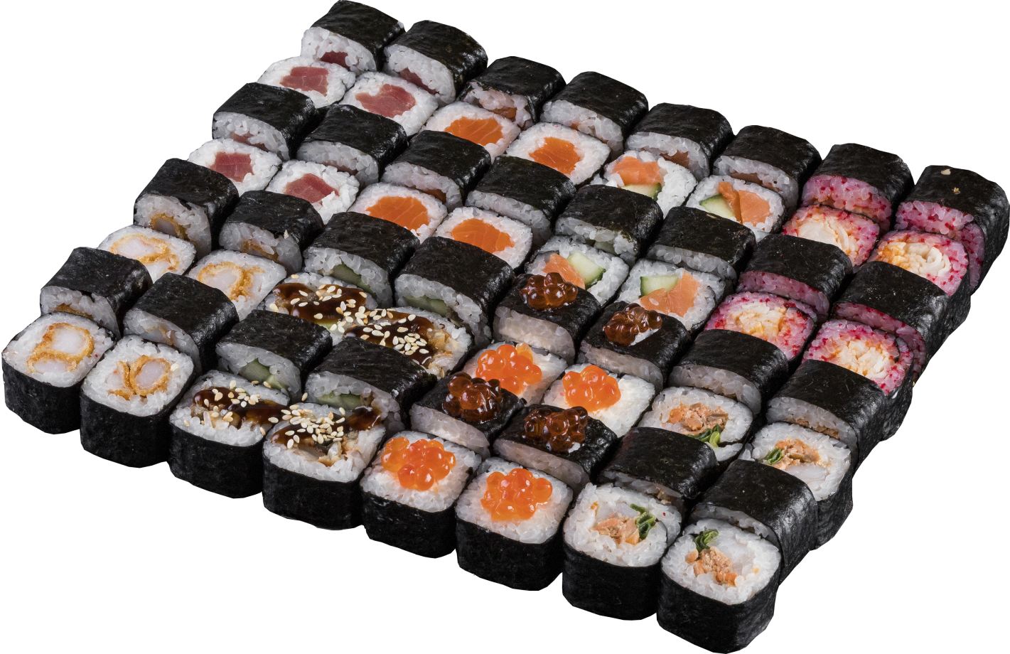 Набор из восьми роллов - ролл "Сякэ Маки", ролл "Сякэ Кунсей Маки", ролл "Икура Маки", ролл "Кани Маки Спайс", ролл "Тэкка Маки", ролл "Эби Маки", ролл "Фурай", ролл "Унаги Маки".