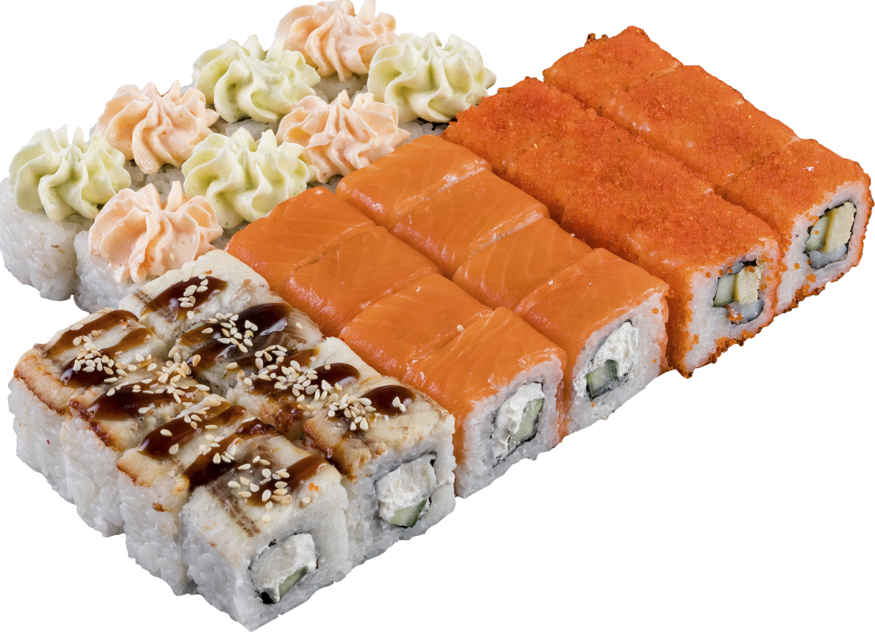 Набор из четырех роллов - ролл "Филадельфия с огурцом", ролл "Дракон Лайт", ролл "Калифорния Осень", ролл "Лава Эби".