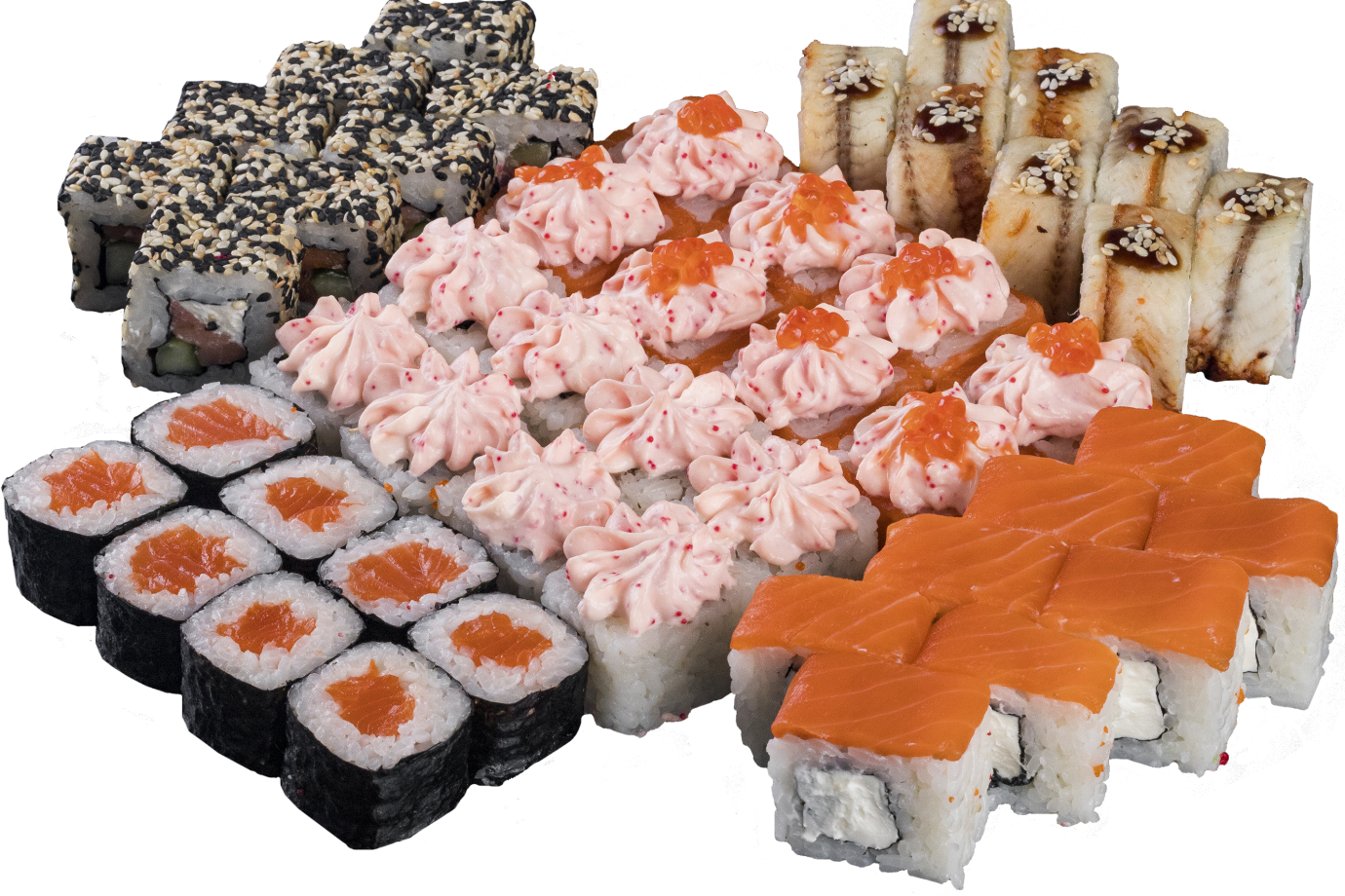 Набор из шести видов роллов - фирменный ролл "Венеция", ролл "Дракон", ролл "Лава", ролл "Сякэ Маки", ролл "Афина", ролл "Гейша".
