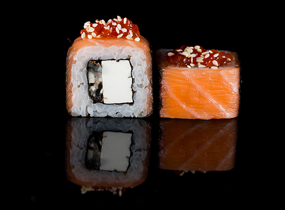 Очень необычный ролл с норвежским лососем, лососевой икрой, копченым угрем, сливочным сыром и кунжутом.